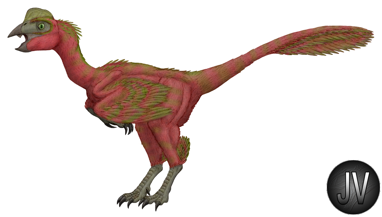 Restauração artística do terópode oviraptor, animal que dá nome à infraordem oviraptorosauria, constituída por dinossauros emplumados e que possuíam bico, tornando-os muito semelhantes às aves modernas. "Oviraptor" significa "ladrão de ovos", nome dado a esse dinossauro pelo fato de se ter encontrado seu esqueleto muito próximo a vários ovos, indicando que o animal estaria os roubando para alimentar-se. Tal teoria não é mais válida, pois hoje sabe-se que os ovos pertenciam ao próprio oviraptor, que deveria estar chocando-os. Desenho feito à mão livre e colorido digitalmente.